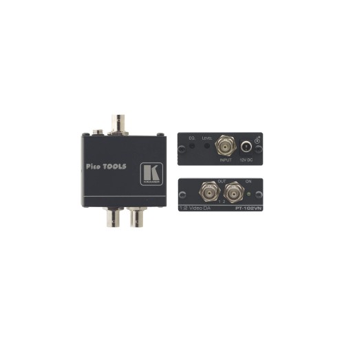 The PT−102VN is a distribution amplifier for composite video or SDI signals. It takes one input, provides correct buffering and isolation and distributes the signal to two identical outputs.