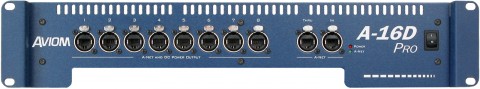 The A-16D Pro A-Net Distributor eliminates the need to daisy chain Personal Mixers, and simplifies set-up by eliminating the need to connect a power supply to each mixer. The A-16D Pro accepts one Pro16 A-Net input signal and provides nine parallel outputs, using rugged EtherCon connectors and standard Cat-5e cables. The A-16D Pro provides isolated (floating ground) DC power through the eight A-Net Outs; the ninth output is an unpowered A-Net Thru connector, designed for distributing a copy of the A-Net signal to a second A-Net Distributor or remote location.